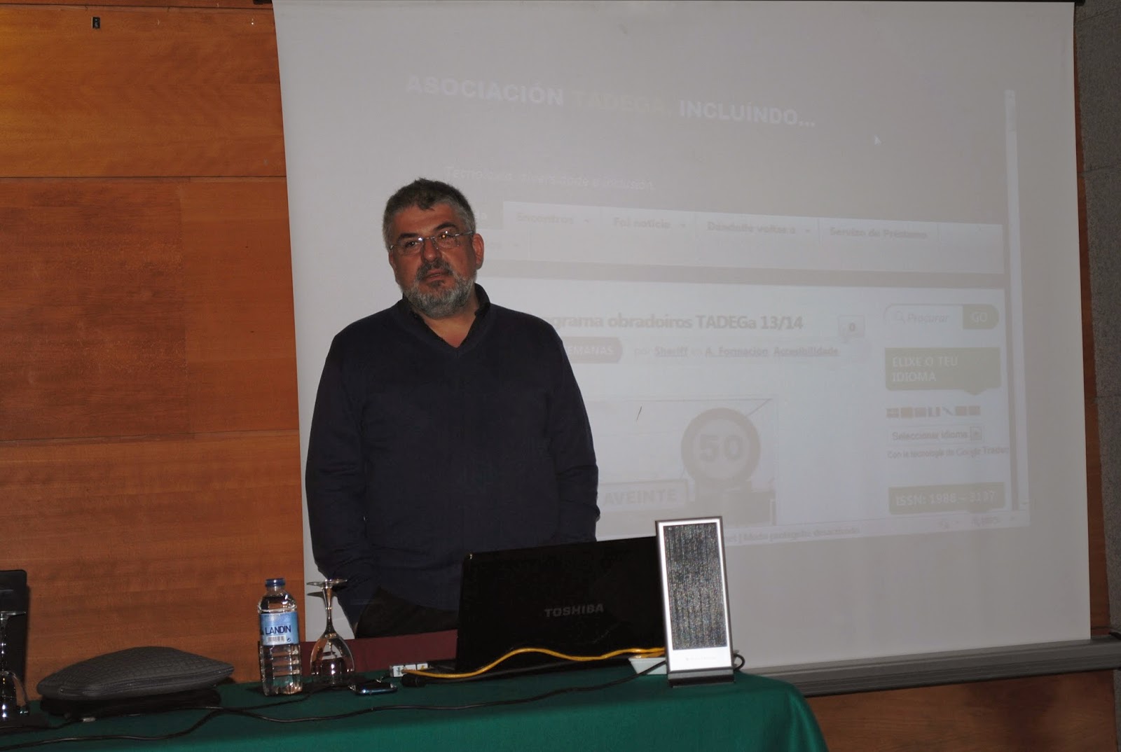 El taller con el título “Herramientas para la Comunicación Alternativa” fue inaugurado por Juan José Fernández García, Presidente de TADEGA y maestro, el cuál nos explicó qué es TADEGA y nos fue mostrando los apartados de la web Tadega.net, parándose sobre todo en el servicio de préstamo de “cacharrería múltiple” y en la Galería Multimedia de TADEGA que enlaza con diversos sistemas pictográficos, sistemas de habla signada y otras webs de gran interés como pueden ser ARASAAC, Harimaguada o Pictoaplicaciones.